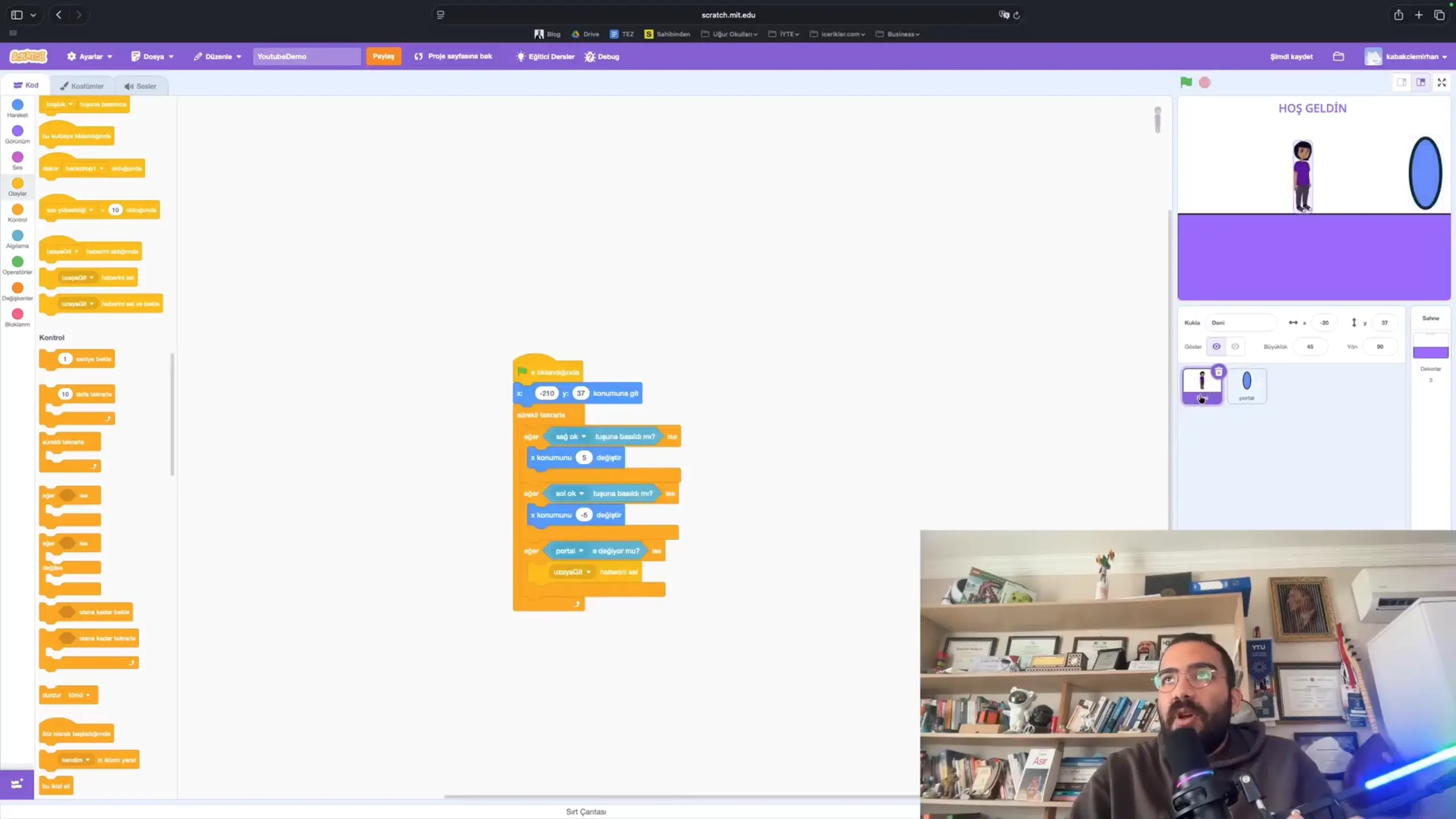 Devam ediyorum arkadaşlar. Burada tabii bir sürü komut var, hepsini tek tek anlatmam mümkün değil, yani anlatabilirim bu videoda da bunu anlatmak daha büyük emek istediği için profesyonel taraflara yönlendireceğim sizi. Udemy kursu çekebilirim veya Youtube’da ücretli bir şey çekebilirim onu yazabilirsiniz. O yüzden arkadaşlar şimdi kostüm, dekor değiştirmeyi de gösterip kapatacağım videoyu. Onu da şöyle yapalım arkadaşlar, bu karakter yürüyor olsun ve şurada bir şey olsun arkadaşlar tamam mı? Ne olsun? Yeni bir sprite ekleyelim kukla ekleyelim, çizim ekleyelim arkadaşlar. Bunun adı portal olsun arkadaşlar tamam mı, hatta kostüme portal diyelim. Bu çemberden, çemberin dolgusunda, portallar genelde böyle mavimsi bir şey oluyor. Şöyle bir portal yapalım. Kontur diyelim. Kontur dış şeyini veriyor arkadaşlar. Ve bunu artıralım. Evet. Bunu küçültelim, portalımızı. Ve sağ kısma koyduk. Tamam. Şimdi, bunun adı ne arkadaşlar? Portal. Bundaki amacımız şu, karakter portala dokunduğu zaman, nebulaya gidecek. Nebula neydi arkadaşlar? Şuydu. Uzaya ışınlanacak yani mantık bu arkadaşlar. O yüzden, eski dekora geri geliyorum, hoş geldine, şimdi, bu hoş geldin dekorunda arkadaşlar bir şey yapacağım. Şimdi bu Dani için yazdığımız kodlar buydu. Dekora kod yazacağız şimdi. Oyun yöneticisi olarak kod yazacağız. Bakın bu karakter kodu. Karakter kodunu yazmak için karaktere tıklıyorum. Portal kodunu yazmak için portala tıklıyorum. Yani siz neyin kodunu yazacaksanız ona tıklamanız gerekiyor. Dekorda ben oyunun genel kodunu yazacağım arkadaşlar. Tamam mı? Öncelikle, yeşil bayrağa tıklandığında, arkadaşlar, ben hoş geldin dekoruna geçilmesini istiyorum. Yani uzay dekoru falan açılmasın daha tamam mı? Başlangıcımız bu. Yeşil bayrağa tıklanınca hoş geldin dekoruna geçilsin. Ardından Dani’ye geldim. Burada şunu yapmam gerekiyor, karakter buna dokununca ona bakalım nerede arkadaşlar, büyük ihtimalle, şeyin içerisinde algılamanın içerisinde olması lazım, evet. Şimdi, “değiyor mu” var arkadaşlar burada, tamam mı? Ama bu değiyor muyu direkt bir şeyin içine alamıyoruz. Süreklinin içerisine alacağız yani yine eğer bir şey değiyor mu. Neye değiyor mu? Portala değiyor mu. Eğer portala değiyorsa Dani, ne yapacağız arkadaşlar biliyor musunuz? Farklı bir şey yapacağız.